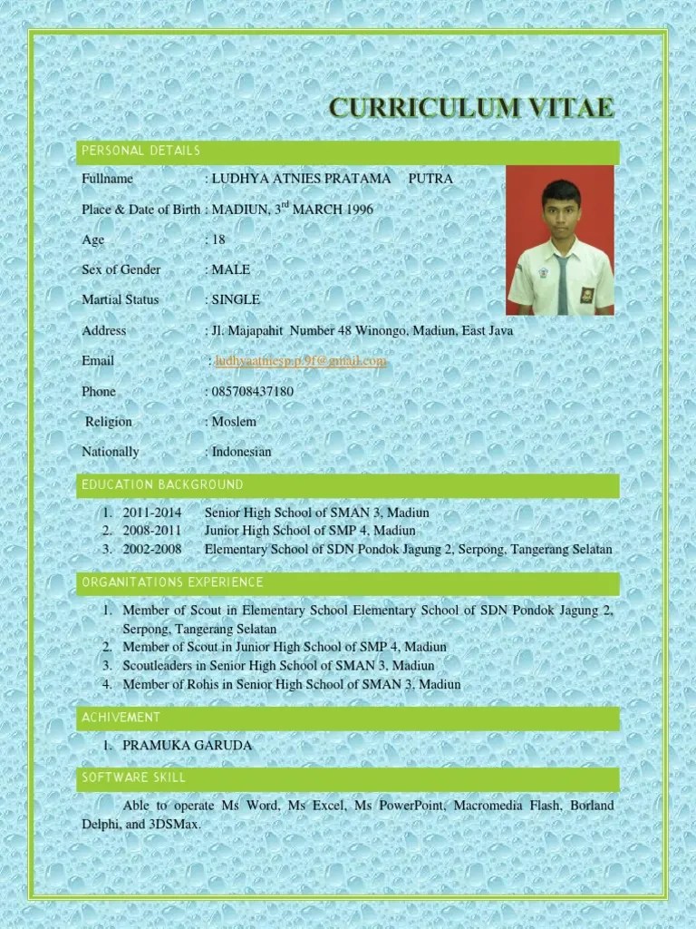 Koleksi 9 Contoh Curriculum Vitae Siswa Sma. Kamu tau ga sih, pembuatan cv berpengaruh terhadap . Senangnya pasti bukan kepalangkarena bisa menyelesaikan studi. Sekolah baik di sma ataupun smk memiliki perbedaan yang sangat jelas. Cv sangat diperlukan nih untuk melamar suatu posisi di sebuah perusahaan guys. Tapi jangan puas dulu, karena masih ada hal lebih .
